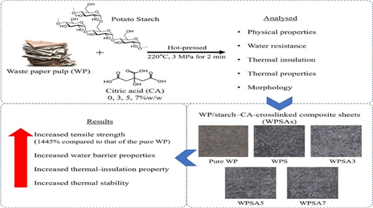 Effects of starch–citric acid cross-linking on the fibrous composites using waste paper pulp material for eco-friendly packaging Itkor, Pontree, Ajit Kumar Singh, Myungho Lee, Athip Boonsiriwit, and Youn Suk Lee Biomass Conversion and Biorefinery 14, no. 13 (2024): 14693-14705.