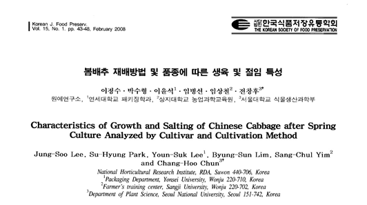 Lee, Jung-Soo, Su-Hyung Park, Youn Suk Lee, Byung-Sun Lim, Sang-Chul Yim, and Chang-Hoo Chun Korean Journal of Food Preservation 15, no. 1 (2008): 43-48.